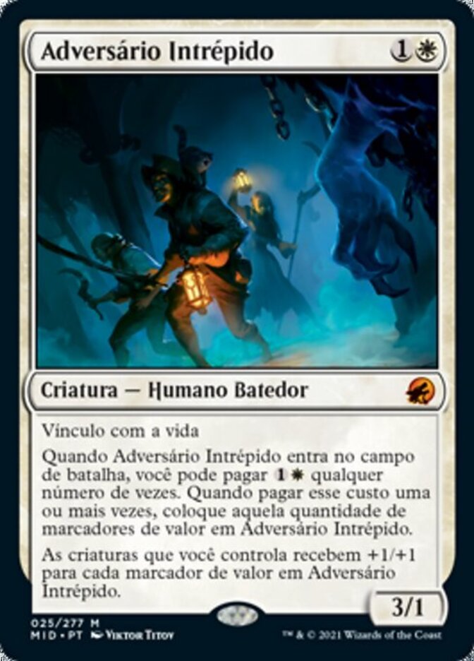 | Rules | Lifelink When Intrepid Adversary enters the battlefield, you may pay any number of times. When you pay this cost one or more times, put that many valor counters on Intrepid Adversary. Creatures you control get +1/+1 for each valor counter on Intrepid Adversary. |