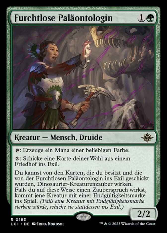 | Rules | : Add one mana of any color. : Exile target card from a graveyard. You may cast Dinosaur creature spells from among cards you own exiled with Intrepid Paleontologist. If you cast a spell this way, that creature enters the battlefield with a finality counter on it. (If a creature with a finality counter on it would die, exile it instead.) |