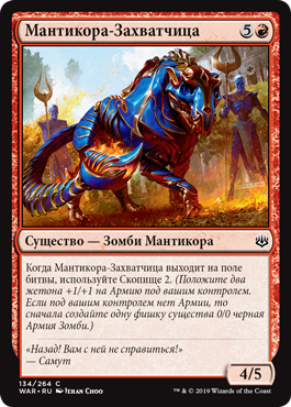 | Rules | When Invading Manticore enters the battlefield, amass 2. (Put two +1/+1 counters on an Army you control. If you don't control one, create a 0/0 black Zombie Army creature token first.) |
