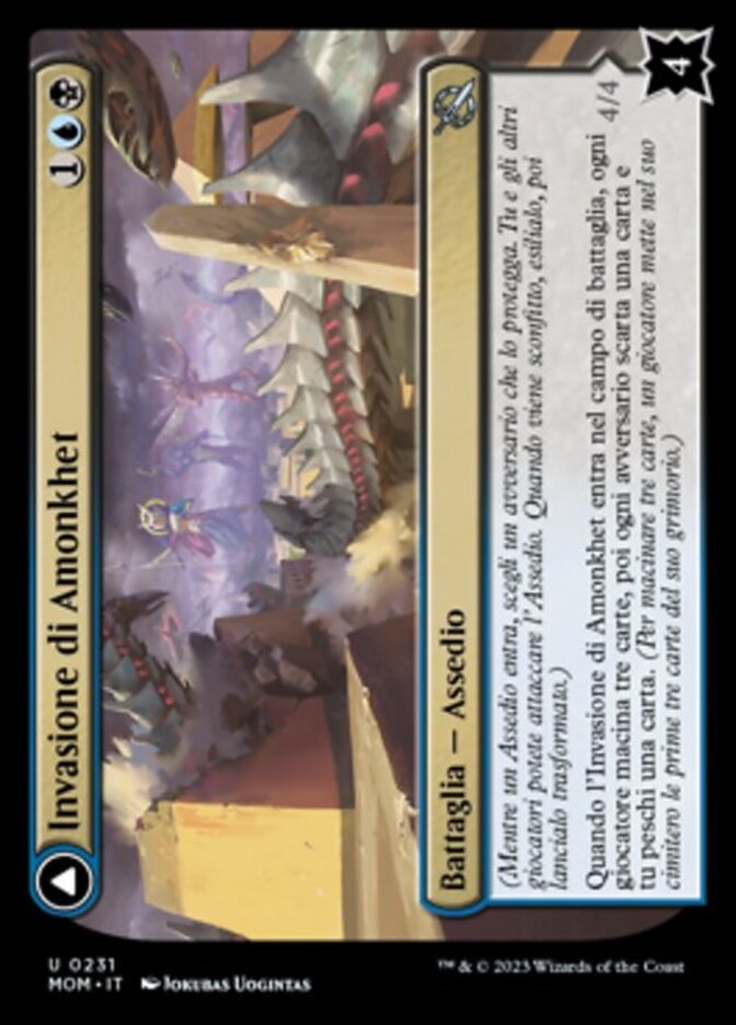 | Rules | (As a Siege enters, choose an opponent to protect it. You and others can attack it. When it's defeated, exile it, then cast it transformed.) When Invasion of Amonkhet enters the battlefield, each player mills three cards, then each opponent discards a card and you draw a card. (To mill three cards, a plaver buts the top three cards of their library into their graveyard.) // You may have Lazotep Convert enter the battlefield as a copy of any creature card in a graveyard, except it's a 4/4 black Zombie in addition to its other types. |