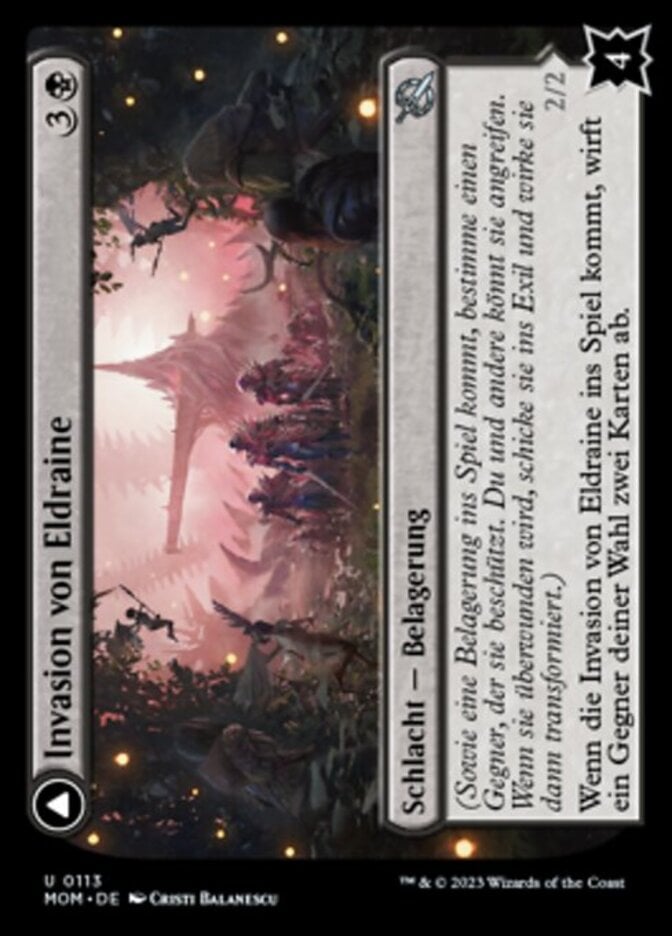 | Rules | (As a Siege enters, choose an opponent to protect it. You and others can attack it. When it's defeated, exile it, then cast it transformed.) When Invasion of Eldraine enters the battlefield, target opponent discards two cards. // Flying At the beginning of each opponent's upkeep, if that player has two or fewer cards in hand, Prickle Faeries deals 2 damage to them. |