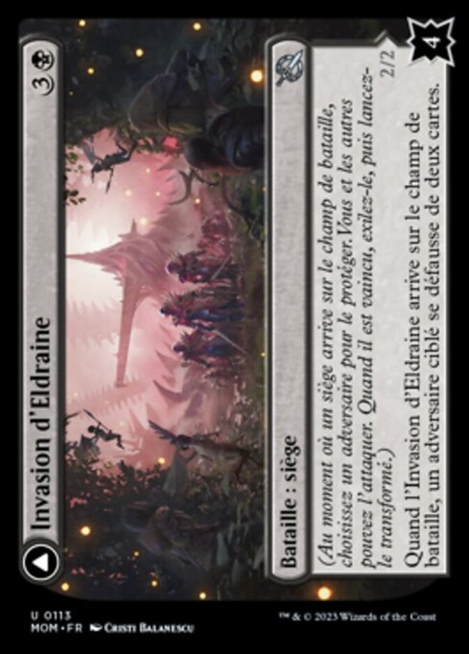 | Rules | (As a Siege enters, choose an opponent to protect it. You and others can attack it. When it's defeated, exile it, then cast it transformed.) When Invasion of Eldraine enters the battlefield, target opponent discards two cards. // Flying At the beginning of each opponent's upkeep, if that player has two or fewer cards in hand, Prickle Faeries deals 2 damage to them. |