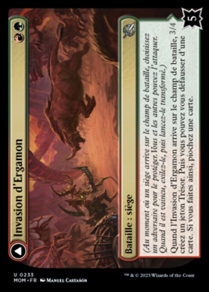 | Rules | (As a Siege enters, choose an opponent to protect it. You and others can attack it. When it's defeated, exile it, then cast it transformed.) When Invasion of Ergamon enters the battlefield, create a Treasure token. Then you may discard a card. If you do, draw a card. // Trample When Truga Cliffcharger enters the battlefield, you may discard a card. If you do, search your library for a land or battle card, reveal it, put it into your hand, then shuffle. |