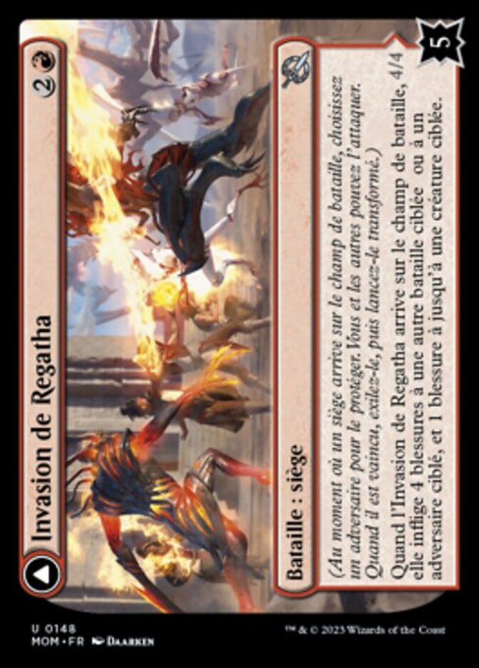 | Rules | (As a Siege enters, choose an opponent to protect it. You and others can attack it. When it's defeated, exile it, then cast it transformed.) When Invasion of Regatha enters the battlefield, it deals 4 damage to another target battle or opponent and 1 damage to up to one target creature. // Prowess (Whenever you cast a noncreature spell, this creature gets +1/+1 until end of turn.) If a noncreature source you control would deal damage to a creature, battle, or opponent, it deals that much damage plus 2 instead. |