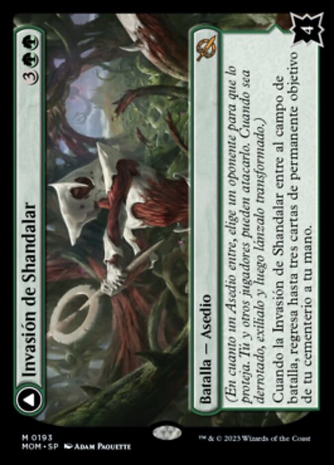 | Rules | (As a Siege enters, choose an opponent to protect it. You and others can attack it. When it's defeated, exile it, then cast it transformed.) When Invasion of Shandalar enters the battlefield, return up to three target permanent cards from your graveyard to your hand. // At the beginning of your upkeep, you may put a permanent card from your hand onto the battlefield. |