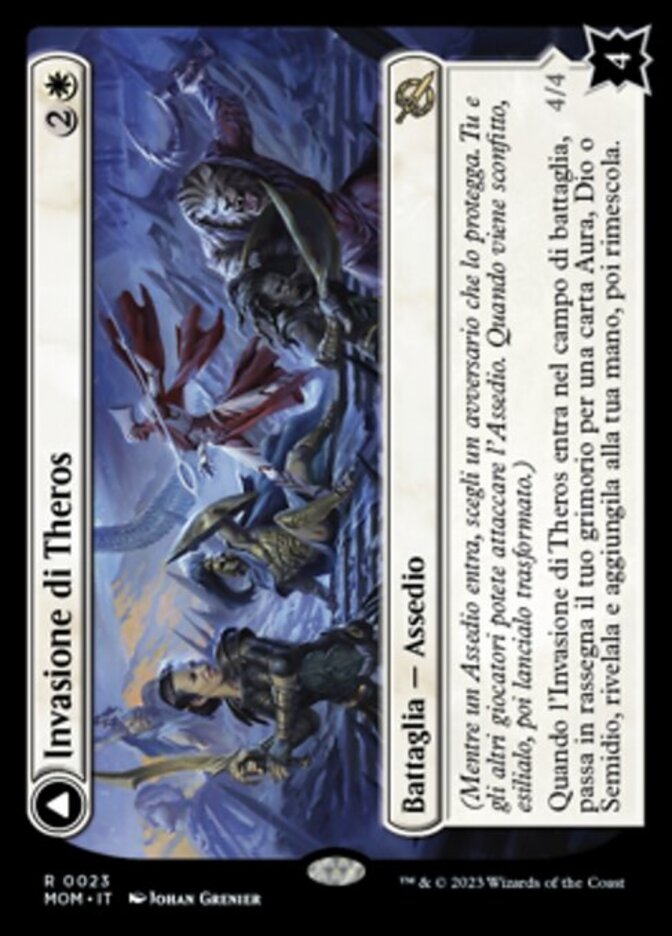 | Rules | (As a Siege enters, choose an opponent to protect it. You and others can attack it. When it's defeated, exile it, then cast it transformed.) When Invasion of Theros enters the battlefield, search your library for an Aura, God, or Demigod card, reveal it, put it into your hand, then shuffle. // Ephara, Ever-Sheltering has lifelink and indestructible as long as you control at least three other enchantments. Whenever another enchantment enters the battlefield under your control, draw a card. |