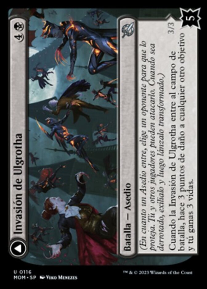 | Rules | (As a Siege enters, choose an opponent to protect it. You and others can attack it. When it's defeated, exile it, then cast it transformed.) When Invasion of Ulgrotha enters the battlefield, it deals 3 damage to any other target and you gain 3 life. // Flying Whenever a creature an opponent controls dies, put a +1/+1 counter on Grandmother Ravi Sengir and you gain 1 life. |