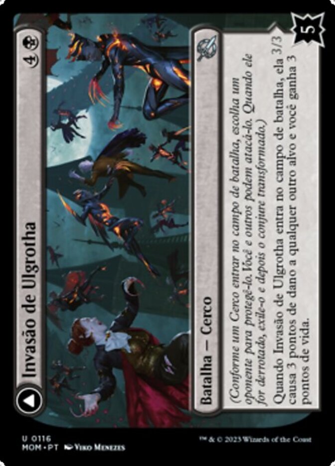 | Rules | (As a Siege enters, choose an opponent to protect it. You and others can attack it. When it's defeated, exile it, then cast it transformed.) When Invasion of Ulgrotha enters the battlefield, it deals 3 damage to any other target and you gain 3 life. // Flying Whenever a creature an opponent controls dies, put a +1/+1 counter on Grandmother Ravi Sengir and you gain 1 life. |