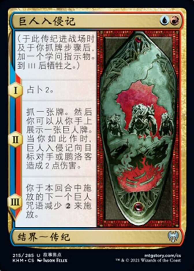 | Rules | (As this Saga enters and after your draw step, add a lore counter. Sacrifice after III.) I — Scry 2. II — Draw a card. Then you may reveal a Giant card from your hand. When you do, Invasion of the Giants deals 2 damage to target opponent or planeswalker. III — The next Giant spell you cast this turn costs less to cast. |
