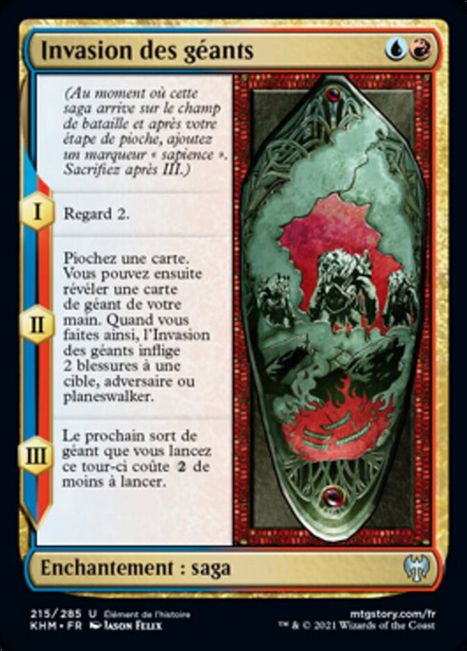 | Rules | (As this Saga enters and after your draw step, add a lore counter. Sacrifice after III.) I — Scry 2. II — Draw a card. Then you may reveal a Giant card from your hand. When you do, Invasion of the Giants deals 2 damage to target opponent or planeswalker. III — The next Giant spell you cast this turn costs less to cast. |