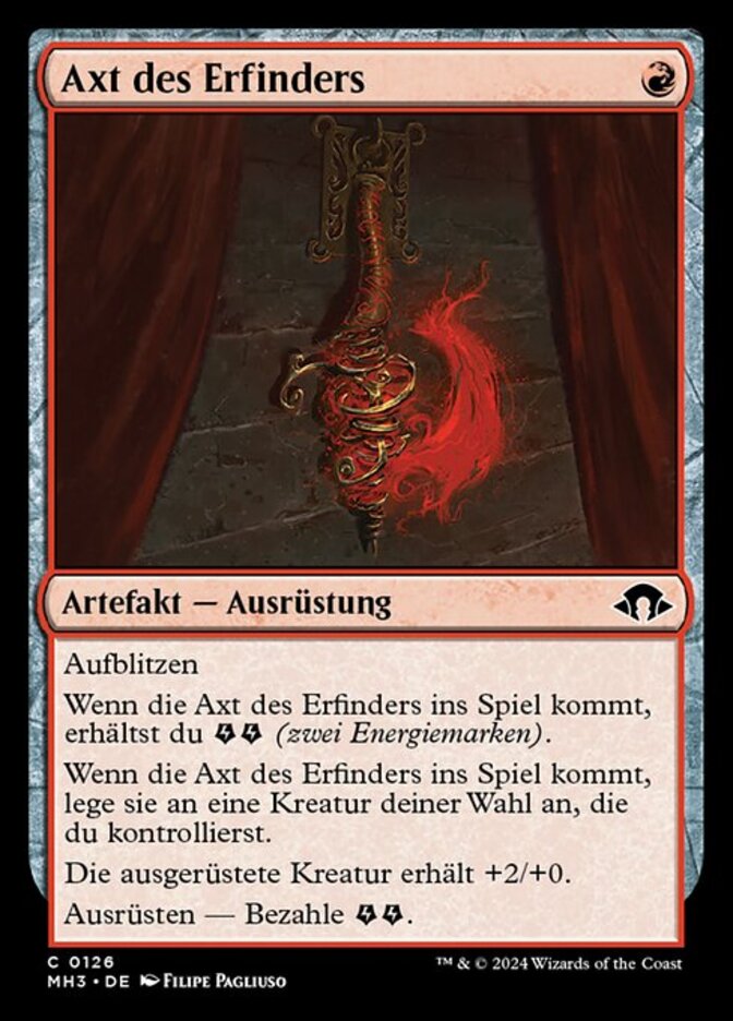 | Rules | Flash When Inventor's Axe enters the battlefield, you get (two energy counters). When Inventor's Axe enters the battlefield, attach it to target creature you control. Equipped creature gets +2/+0. Equip—Pay . |