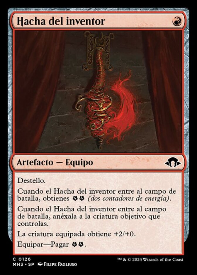 | Rules | Flash When Inventor's Axe enters the battlefield, you get (two energy counters). When Inventor's Axe enters the battlefield, attach it to target creature you control. Equipped creature gets +2/+0. Equip—Pay . |