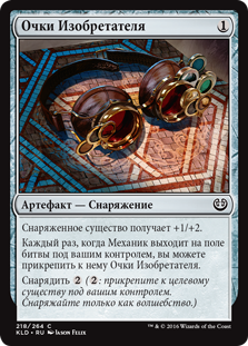 | Rules | Equipped creature gets +1/+2. Whenever an Artificer enters the battlefield under your control, you may attach Inventor's Goggles to it. Equip (: Attach to target creature you control. Equip only as a sorcery.) |