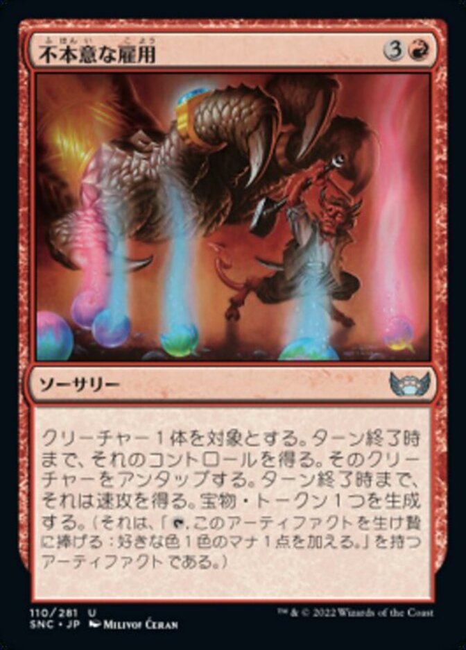 | Rules | Gain control of target creature until end of turn. Untap that creature. It gains haste until end of turn. Create a Treasure token. (It's an artifact with ", Sacrifice this artifact: Add one mana of any color.") |