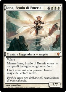 | Rules | Flying As Iona, Shield of Emeria enters the battlefield, choose a color. Your opponents can't cast spells of the chosen color. |