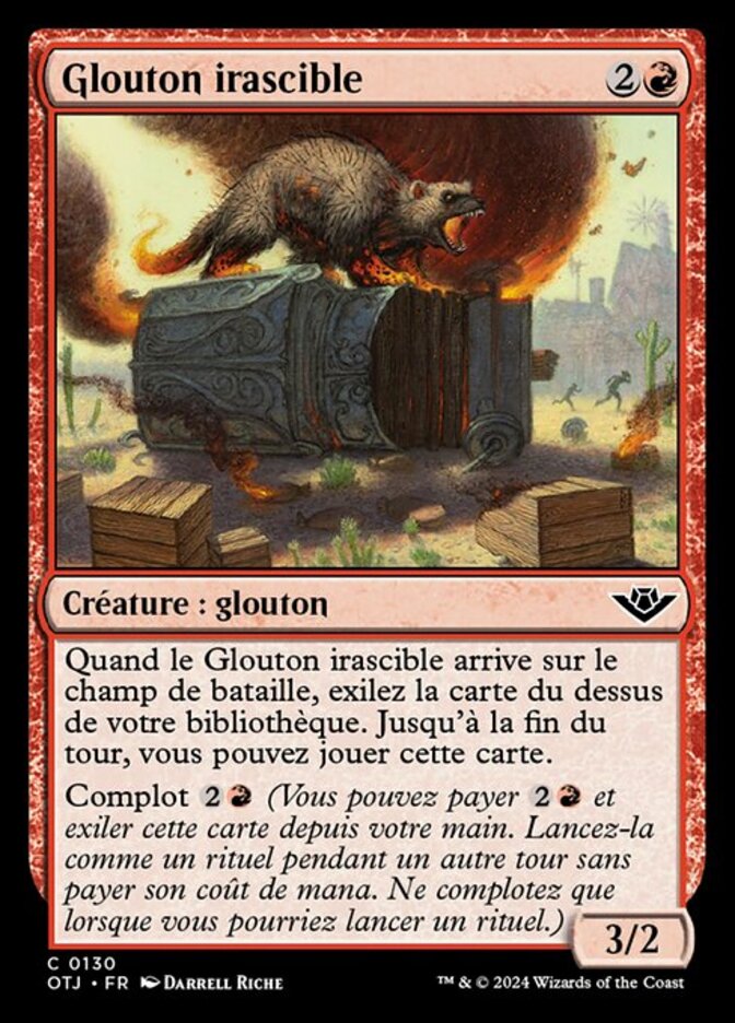 | Rules | When Irascible Wolverine enters the battlefield, exile the top card of your library. Until end of turn, you may play that card. Plot (You may pay and exile this card from your hand. Cast it as a sorcery on a later turn without paying its mana cost. Plot only as a sorcery.) |
