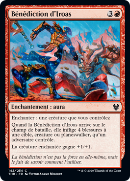 | Rules | Enchant creature you control When Iroas's Blessing enters the battlefield, it deals 4 damage to target creature or planeswalker an opponent controls. Enchanted creature gets +1/+1. |