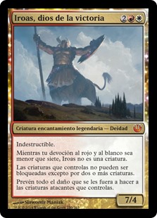 | Rules | Indestructible As long as your devotion to red and white is less than seven, Iroas isn't a creature. Creatures you control have menace. Prevent all damage that would be dealt to attacking creatures you control. |