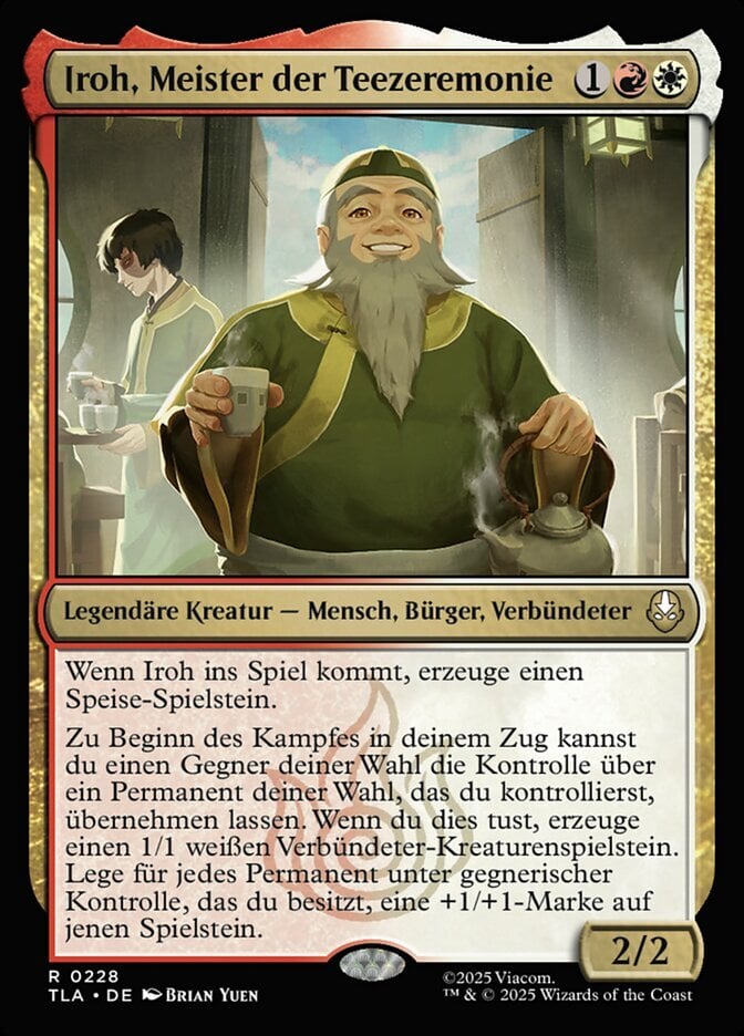 | Rules | When Iroh enters, create a Food token. At the beginning of combat on your turn, you may have target opponent gain control of target permanent you control. When you do, create a 1/1 white Ally creature token. Put a +1/+1 counter on that token for each permanent you own that your opponents control. |