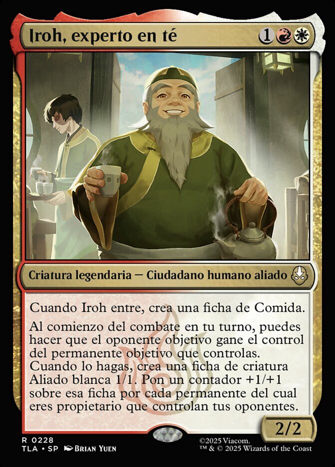 | Rules | When Iroh enters, create a Food token. At the beginning of combat on your turn, you may have target opponent gain control of target permanent you control. When you do, create a 1/1 white Ally creature token. Put a +1/+1 counter on that token for each permanent you own that your opponents control. |