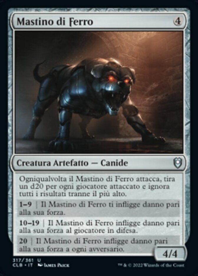 | Rules | Whenever Iron Mastiff attacks, roll a d20 for each player being attacked and ignore all but the highest roll. 1-9 | Iron Mastiff deals damage equal to its power to you. 10-19 | Iron Mastiff deals damage equal to its power to defending player. 20 | Iron Mastiff deals damage equal to its power to each opponent. |