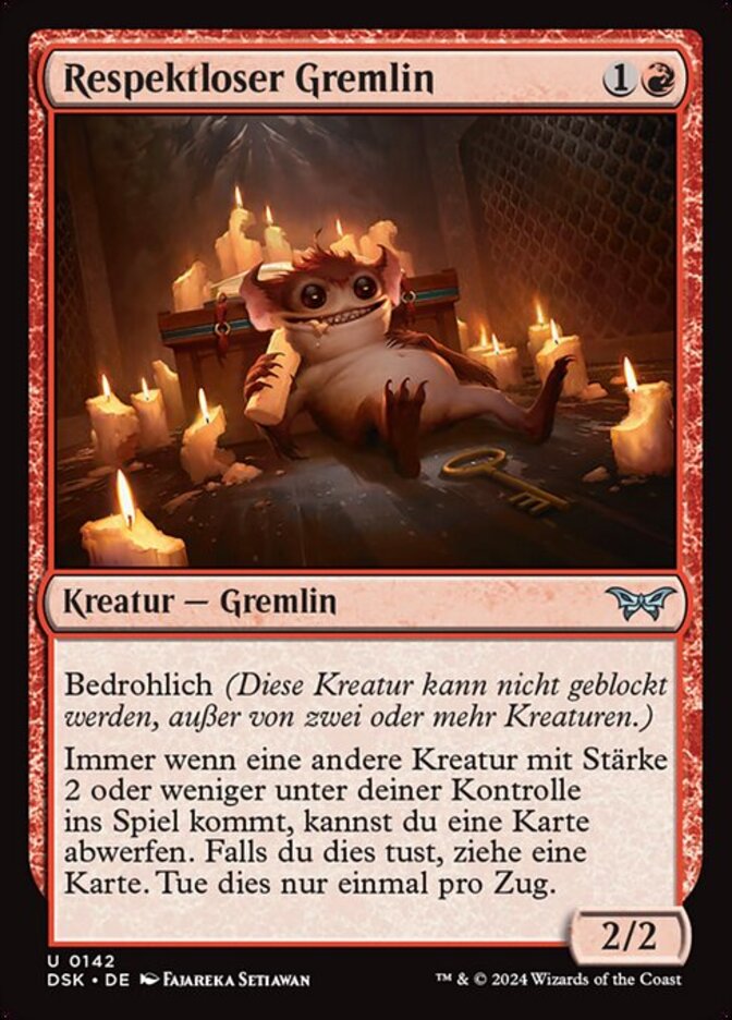 | Rules | Menace (This creature can't be blocked except by two or more creatures.) Whenever another creature you control with power 2 or less enters, you may discard a card. If you do, draw a card. Do this only once each turn. |