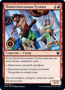| Rules | When Irreverent Revelers enters the battlefield, choose one — • Destroy target artifact. • Irreverent Revelers gains haste until end of turn. |