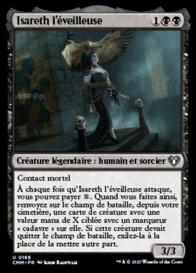 | Rules | Deathtouch Whenever Isareth the Awakener attacks, you may pay . When you do, return target creature card with mana value X from your graveyard to the battlefield with a corpse counter on it. If that creature would leave the battlefield, exile it instead of putting it anywhere else. |