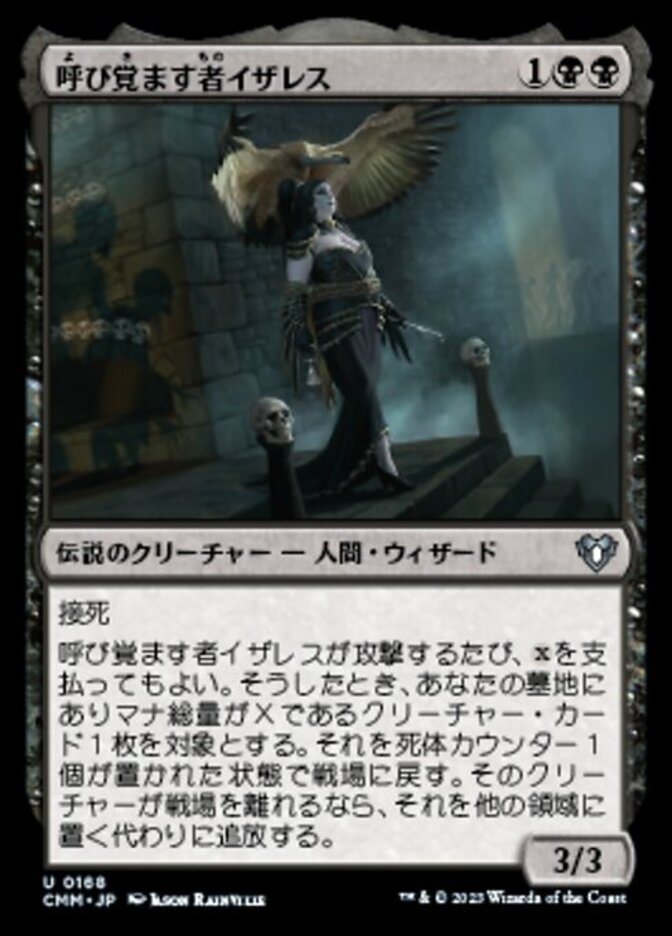 | Rules | Deathtouch Whenever Isareth the Awakener attacks, you may pay . When you do, return target creature card with mana value X from your graveyard to the battlefield with a corpse counter on it. If that creature would leave the battlefield, exile it instead of putting it anywhere else. |