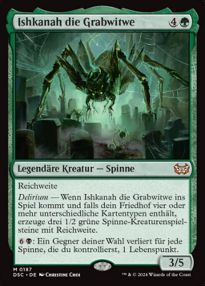 | Rules | Reach Delirium — When Ishkanah, Grafwidow enters the battlefield, if there are four or more card types among cards in your graveyard, create three 1/2 green Spider creature tokens with reach. : Target opponent loses 1 life for each Spider you control. |