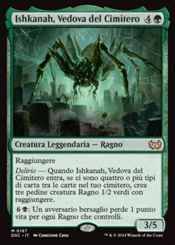 | Rules | Reach Delirium — When Ishkanah, Grafwidow enters the battlefield, if there are four or more card types among cards in your graveyard, create three 1/2 green Spider creature tokens with reach. : Target opponent loses 1 life for each Spider you control. |