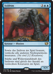 | Rules | As Ixidron enters the battlefield, turn all other nontoken creatures face down. (They're 2/2 creatures.) Ixidron's power and toughness are each equal to the number of face-down creatures on the battlefield. |