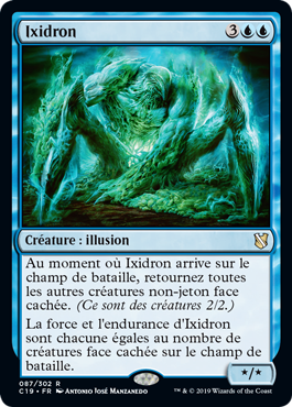 | Rules | As Ixidron enters the battlefield, turn all other nontoken creatures face down. (They're 2/2 creatures.) Ixidron's power and toughness are each equal to the number of face-down creatures on the battlefield. |