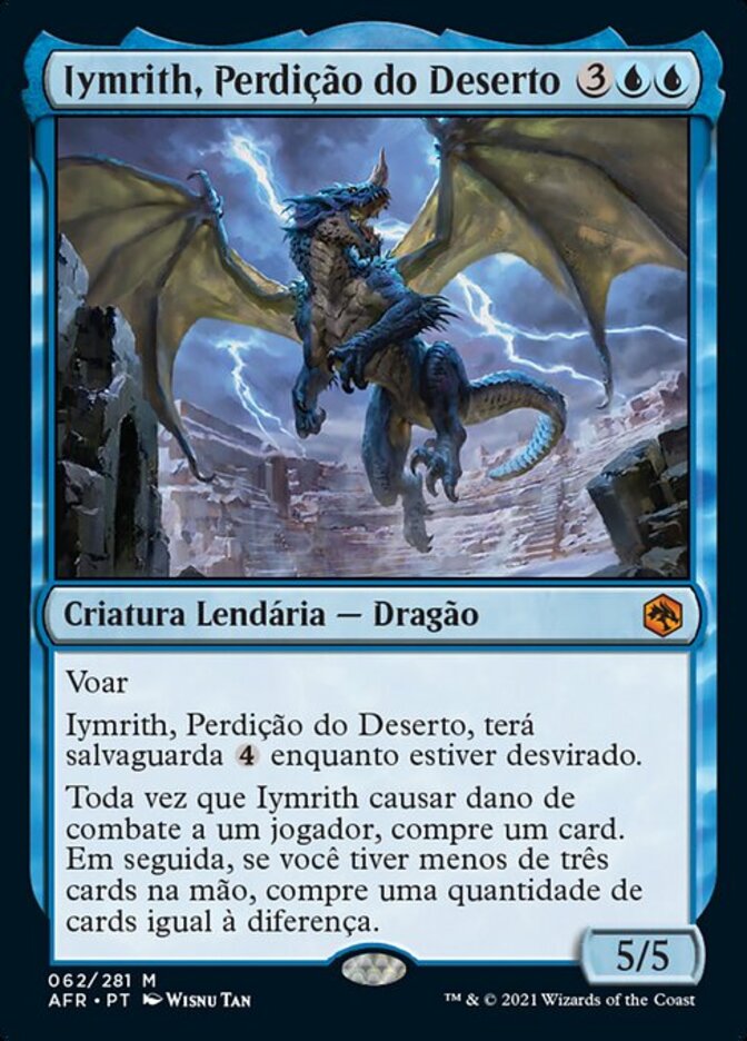 | Rules | Flying Iymrith, Desert Doom has ward as long as it's untapped. Whenever Iymrith deals combat damage to a player, draw a card. Then if you have fewer than three cards in hand, draw cards equal to the difference. |