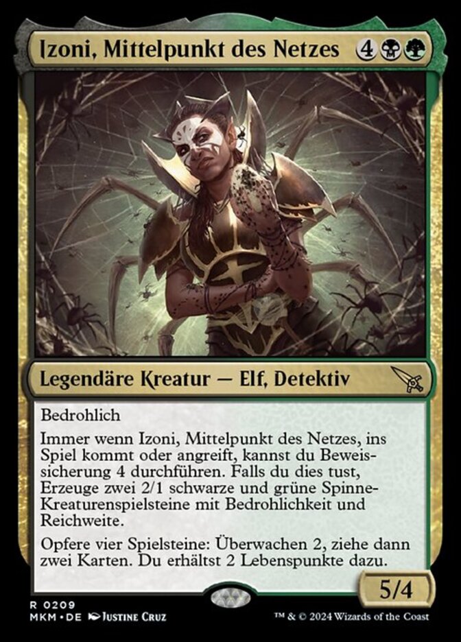 | Rules | Menace Whenever Izoni, Center of the Web enters the battlefield or attacks, you may collect evidence 4. If you do, create two 2/1 black and green Spider creature tokens with menace and reach. Sacrifice four tokens: Surveil 2, then draw two cards. You gain 2 life. |