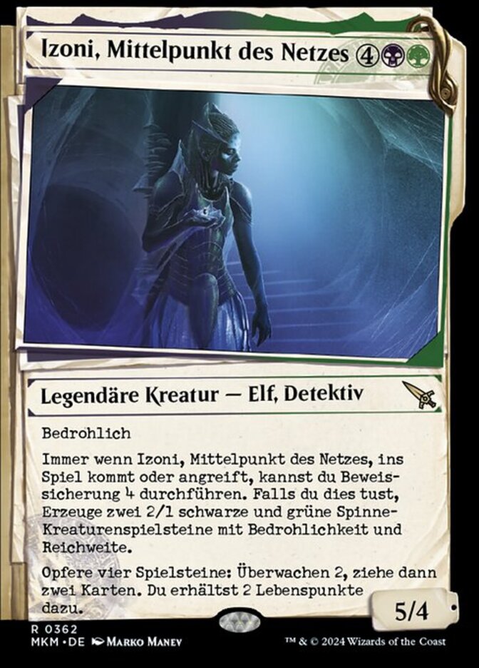 | Rules | Menace Whenever Izoni, Center of the Web enters the battlefield or attacks, you may collect evidence 4. If you do, create two 2/1 black and green Spider creature tokens with menace and reach. Sacrifice four tokens: Surveil 2, then draw two cards. You gain 2 life. |