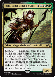 | Rules | Undergrowth — When Izoni, Thousand-Eyed enters the battlefield, create a 1/1 black and green Insect creature token for each creature card in your graveyard. , Sacrifice another creature: You gain 1 life and draw a card. |