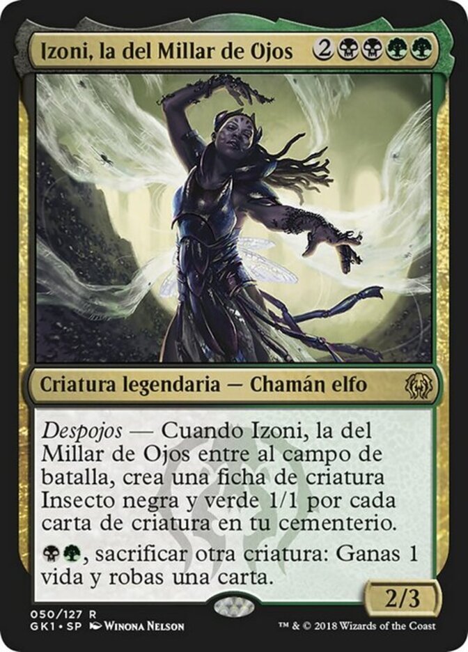 | Rules | Undergrowth — When Izoni, Thousand-Eyed enters the battlefield, create a 1/1 black and green Insect creature token for each creature card in your graveyard. , Sacrifice another creature: You gain 1 life and draw a card. |