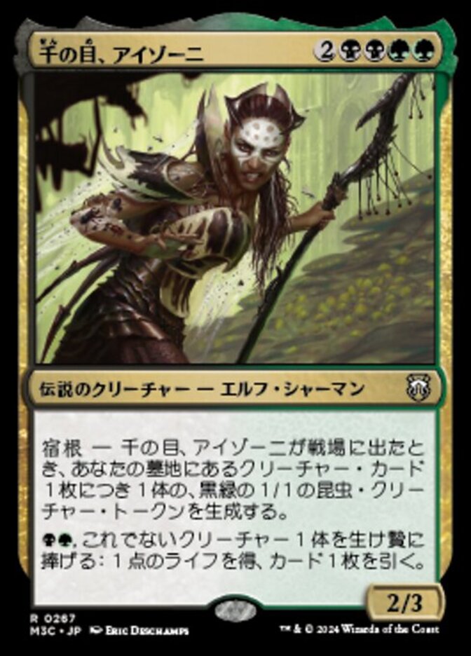 | Rules | Undergrowth — When Izoni, Thousand-Eyed enters the battlefield, create a 1/1 black and green Insect creature token for each creature card in your graveyard. , Sacrifice another creature: You gain 1 life and draw a card. |