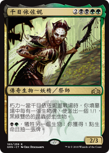 | Rules | Undergrowth — When Izoni, Thousand-Eyed enters the battlefield, create a 1/1 black and green Insect creature token for each creature card in your graveyard. , Sacrifice another creature: You gain 1 life and draw a card. |