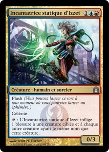 | Rules | Flash (You may cast this spell any time you could cast an instant.) Haste : Izzet Staticaster deals 1 damage to target creature and each other creature with the same name as that creature. |