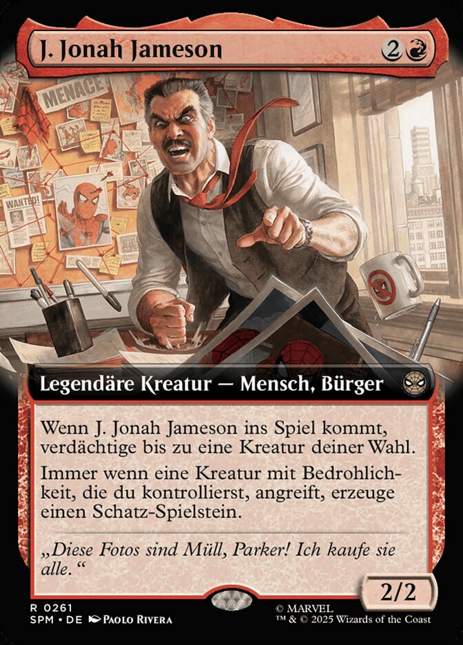 | Rules | When J. Jonah Jameson enters, suspect up to one target creature. Whenever a creature you control with menace attacks, create a Treasure token. |