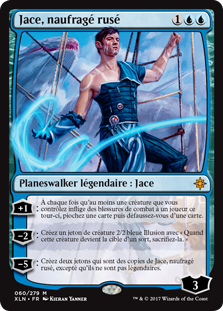 | Rules | +1: Whenever one or more creatures you control deal combat damage to a player this turn, draw a card, then discard a card. −2: Create a 2/2 blue Illusion creature token with "When this creature becomes the target of a spell, sacrifice it." −5: Create two tokens that are copies of Jace, Cunning Castaway, except they're not legendary. |
