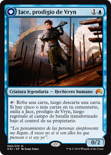 | Rules | : Draw a card, then discard a card. If there are five or more cards in your graveyard, exile Jace, Vryn's Prodigy, then return him to the battlefield transformed under his owner's control. // +1: Up to one target creature gets -2/-0 until your next turn. −3: You may cast target instant or sorcery card from your graveyard this turn. If that spell would be put into your graveyard this turn, exile it instead. −9: You get an emblem with "Whenever you cast a spell, target opponent mills five cards." |