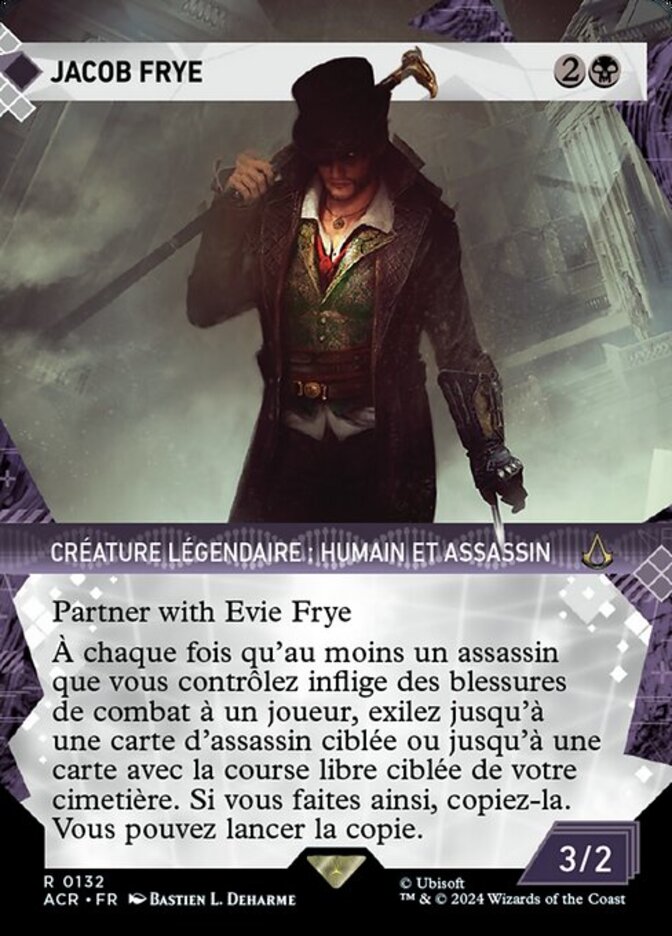 | Rules | Partner with Evie Frye (When this creature enters the battlefield, target player may put Evie into their hand from their library, then shuffle.) Whenever one or more Assassins you control deal combat damage to a player, exile up to one target Assassin card or card with freerunning from your graveyard. If you do, copy it. You may cast the copy. |