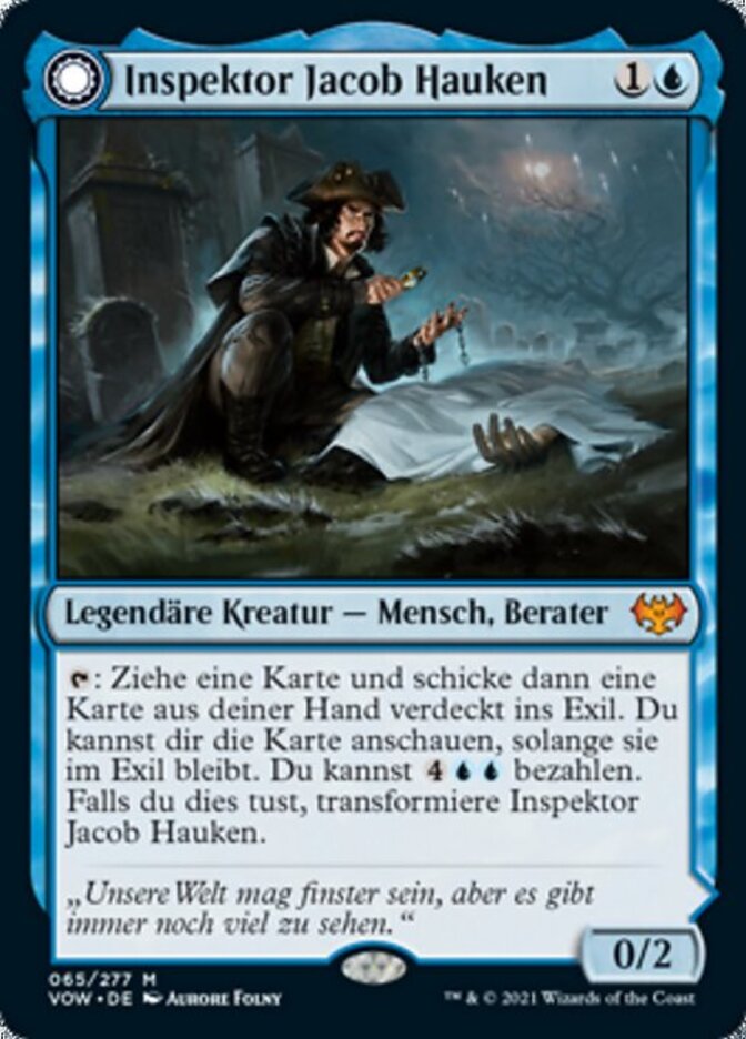 | Rules | : Draw a card, then exile a card from your hand face down. You may look at that card for as long as it remains exiled. You may pay . If you do, transform Jacob Hauken, Inspector. // At the beginning of your upkeep, exile the top card of your library face down. You may look at that card for as long as it remains exiled. Once during each of your turns, you may play a land or cast a spell from among the cards exiled with this permanent without paying its mana cost. |