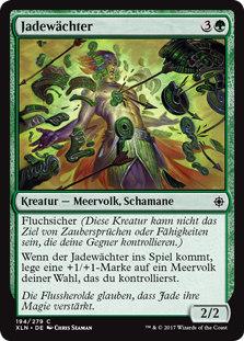 | Rules | Hexproof (This creature can't be the target of spells or abilities your opponents control.) When Jade Guardian enters the battlefield, put a +1/+1 counter on target Merfolk you control. |