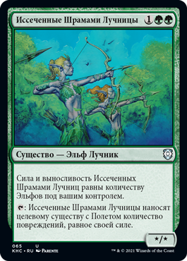 | Rules | Jagged-Scar Archers's power and toughness are each equal to the number of Elves you control. : Jagged-Scar Archers deals damage equal to its power to target creature with flying. |