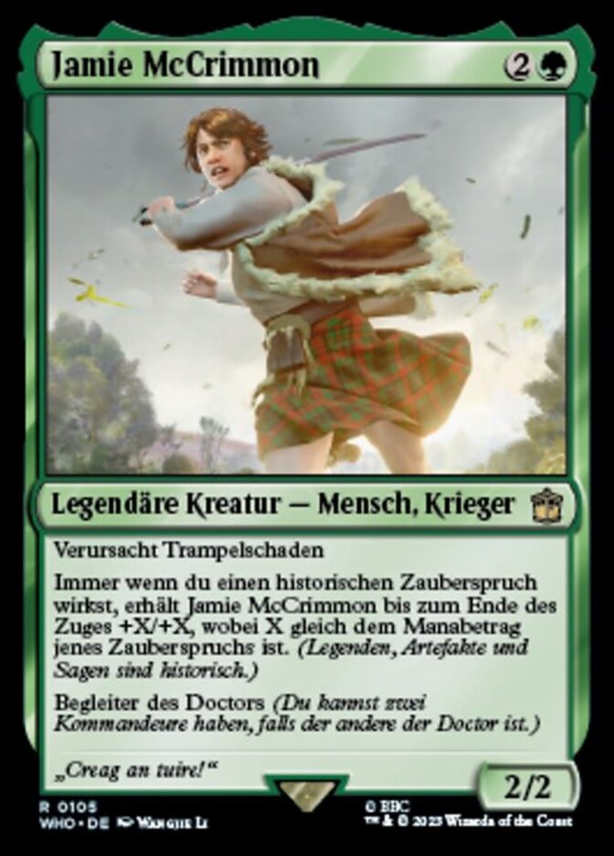 | Rules | Trample Whenever you cast a historic spell, Jamie McCrimmon gets +X/+X until end of turn, where X is that spell's mana value. (Artifacts, legendaries, and Sagas are historic.) Doctor's companion (You can have two commanders if the other is the Doctor.) |