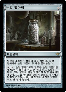 | Rules | Whenever a creature you control dies, put two eyeball counters on Jar of Eyeballs. , , Remove all eyeball counters from Jar of Eyeballs: Look at the top X cards of your library, where X is the number of eyeball counters removed this way. Put one of them into your hand and the rest on the bottom of your library in any order. |